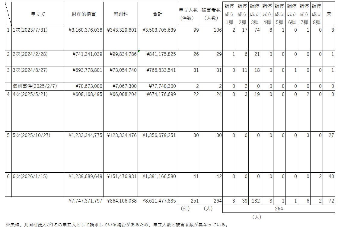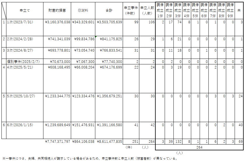 これにより、調停未成立の申立人は39名となり、同日までに、調停成立した人数・金額の合計は下記のとおりとなります。