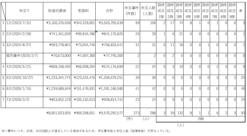 1/15 ■ 本日、新たに、被害者41人が計13億7577万9280円(財産的損害12億3430万2349円、慰謝料1億4147万6931円)を求めて、集団調停を申し立てました(6次)。
