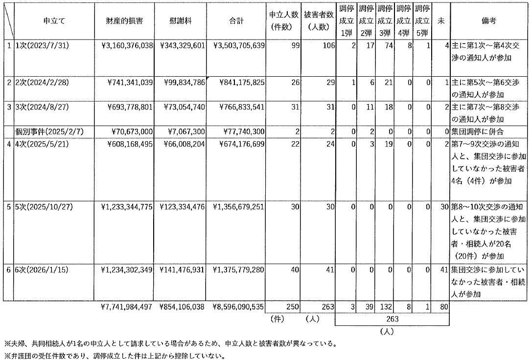 ■1/15 本日、新たに、被害者41人が計13億7577万9280円(財産的損害12億3430万2349円、慰謝料1億4147万6931円)を求めて、集団調停を申し立てました(6次)。